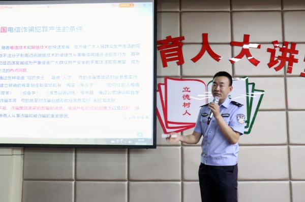 随后他通过列举电信诈骗团伙具体的事实案例,对电信诈骗团伙的集团化、公司化做出了详细的论述,并指出相应的具体措施,用幽默风趣的语言让师生对各种电信诈骗有更深入的了解与清晰的认识。