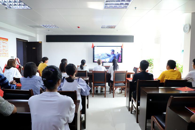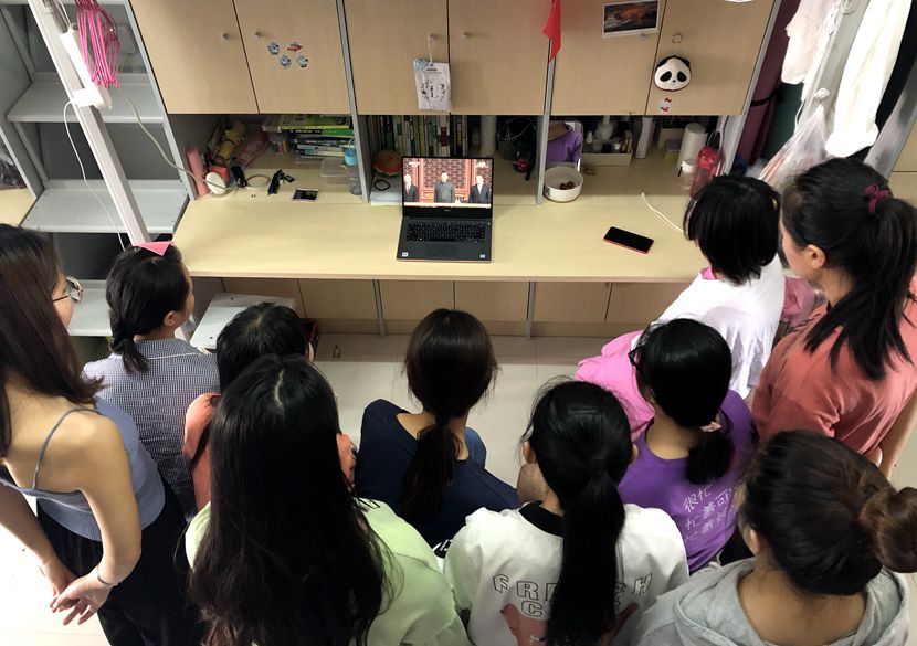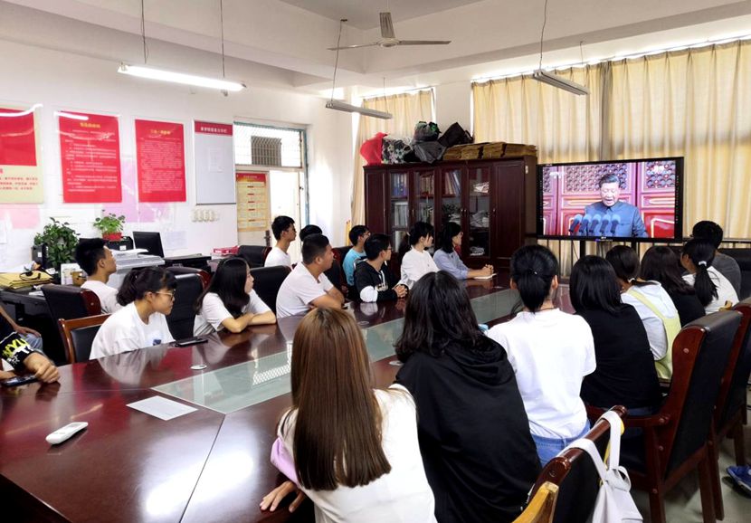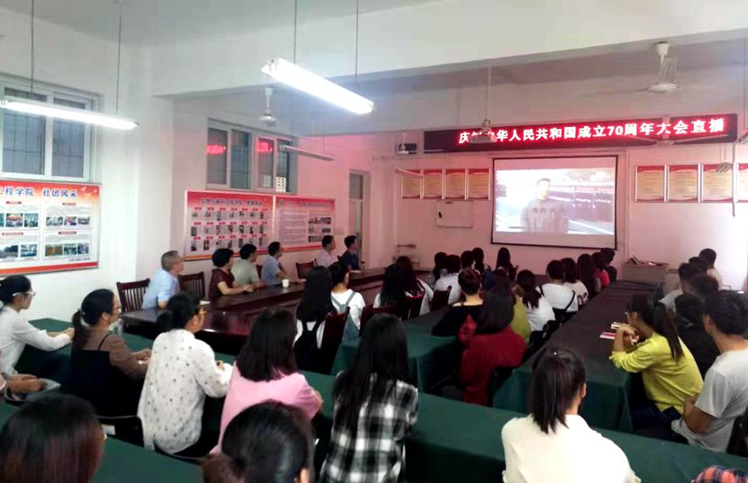 在校领导和相关部门负责同志在综合楼6楼会议室集中收听收看大会实况。各党总支、各师生党支部也利用报告厅、活动室等多地收听收看。各个观看现场氛围浓厚,伴随着习近平总书记讲话、阅兵仪式和群众游行环节的展开,现场不时爆发出热烈的掌声。