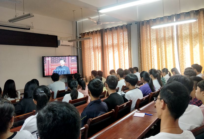 10月1日上午10时,庆祝中华人民共和国成立70周年大会在北京天安门广场隆重举行,中共中央总书记、国家主席、中央军委主席习近平出席大会并发表重要讲话。beat365在线平台官网师生通过广播、电视、网络、手机客户端等,收听收看大会实况,深入学习习近平总书记重要讲话精神。