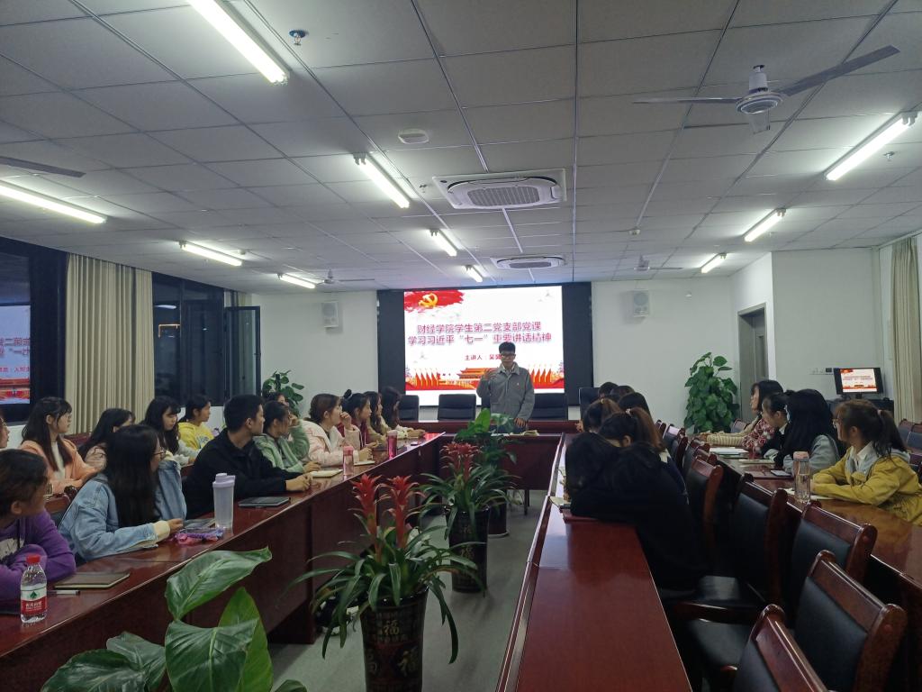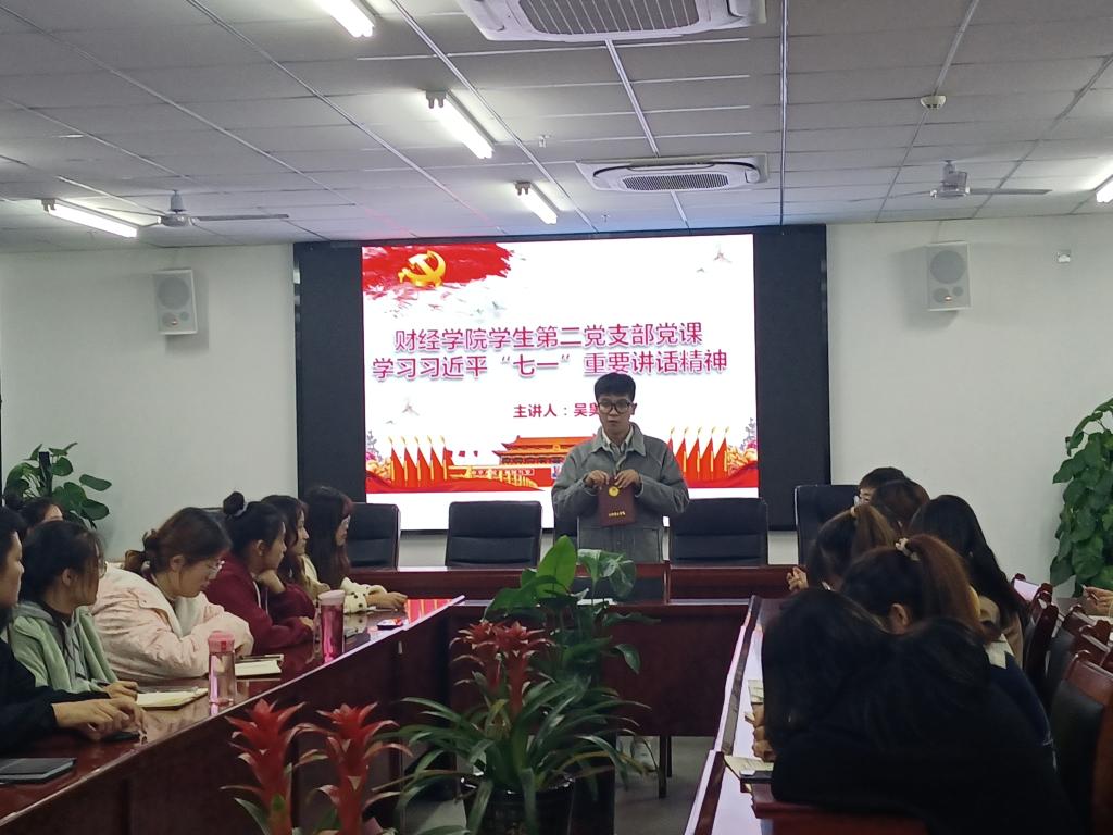 为深入学习习近平总书记“七一”重要讲话精神,进一步统一思想、提高认识,从党的百年伟大奋斗历程中汲取继续前进的智慧和力量,10月26日晚,财经学院学生第二党支部书记吴昊在双创中心408会议室,为财经学院学生第二党支部正式党员、预备党员及入党积极分子上了题为《学习习近平总书记“七一”重要讲话精神强化责任担当,争做时代新人》的专题党课。