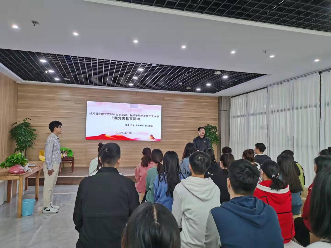 为深切缅怀革命先辈,深入开展党史学习教育,进一步激发广大党员干部的爱国热情,弘扬爱国主义精神,11月2日,机关招生就业双创中心党支部携手财经学院学生第二党支部开展观看“四史”教育影片《长津湖》的党史学习教育,支部全体党员参与观影活动。