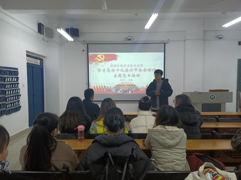 为认真学习贯彻党的十九届六中全会精神,深刻领会和全面把握党百年奋斗的伟大成就、伟大意义和伟大经验,11月22日,财经学院学生第二党支部书记吴昊在二教113室,为财经学院学生第二党支部正式党员、预备党员上了题为《学习党的十九届六中全会精神,共同重温初心使命》的专题党课。