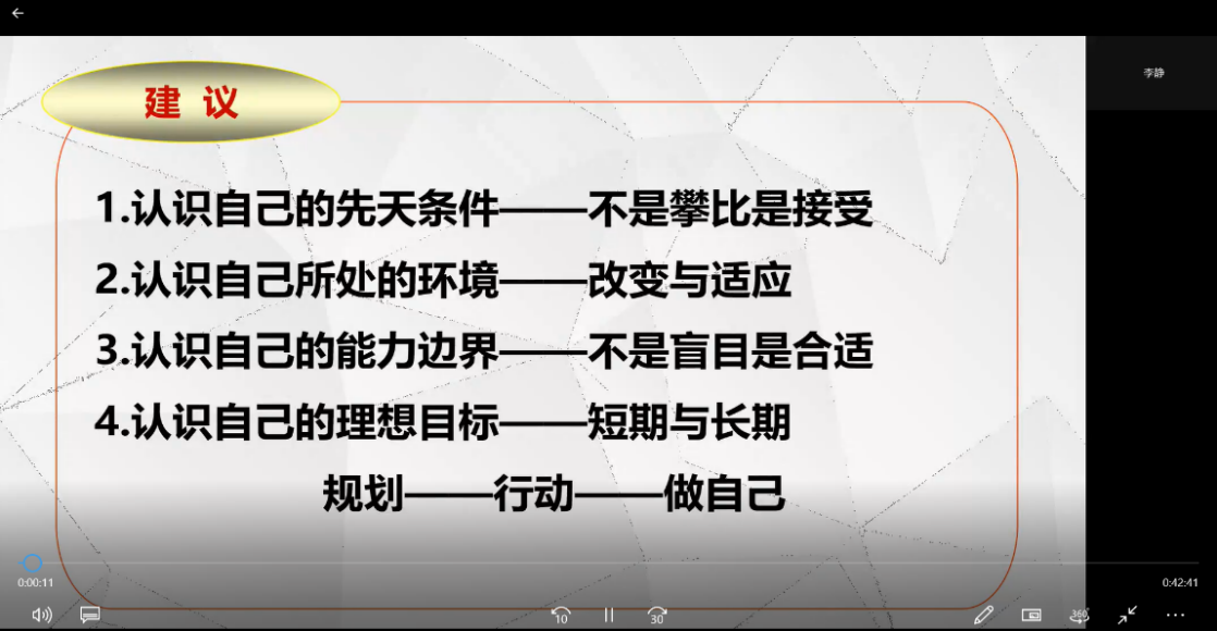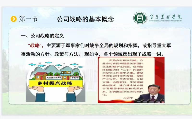 4.汤朦老师在《公司战略与风险管理》开学第一课中积极融入课程思政。在战略定义讲解部分,汤朦老师以“乡村振兴战略”为例,适当引入课程思政,激发学生学习兴趣。