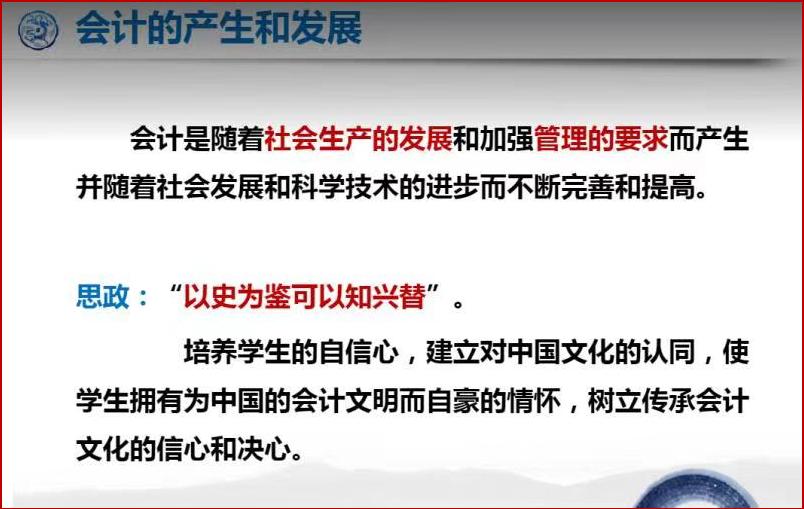 1.刘莹莹老师在《会计学基础》开学第一课中通过讲解会计的产生和发展,使学生拥有为中国的会计文明而自豪的情怀,树立传承会计文化的信心和决心,在开学第一课中使学生认识到以史为鉴,继往开来。