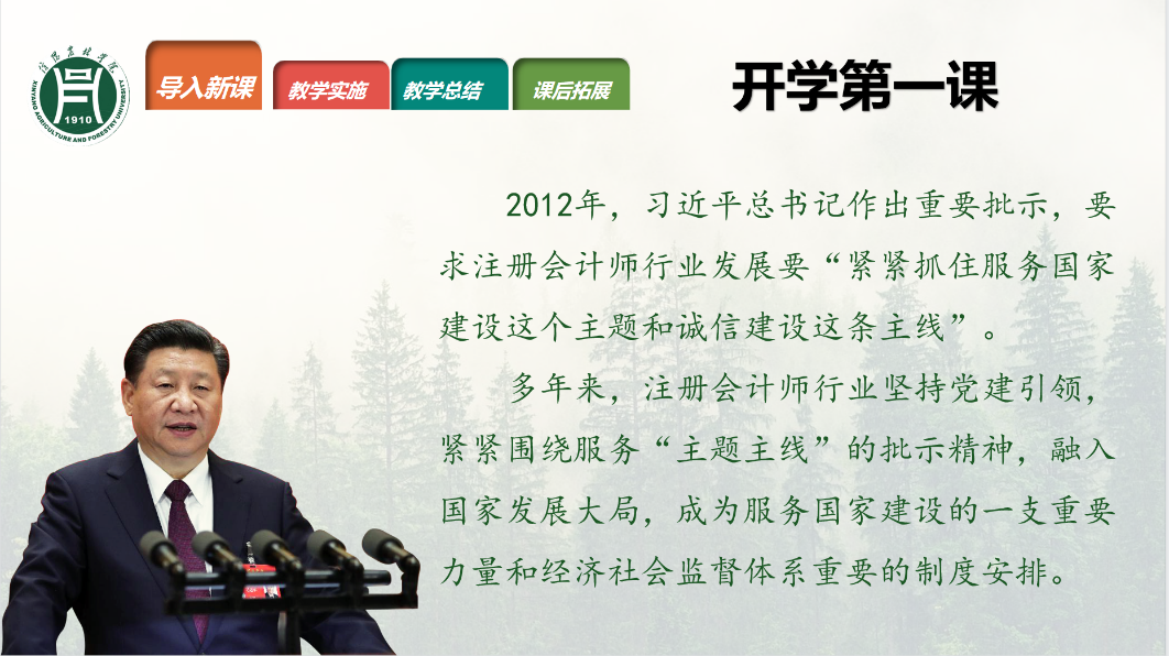 5.张斐然老师在《审计》开学第一课中结合习近平总书记对注册会计师行业的重要批示,明确了注册会计师审计的重要性,在开学第一课中使得学生深入感受到注册会计师审计对于市场经济监督的重要意义。