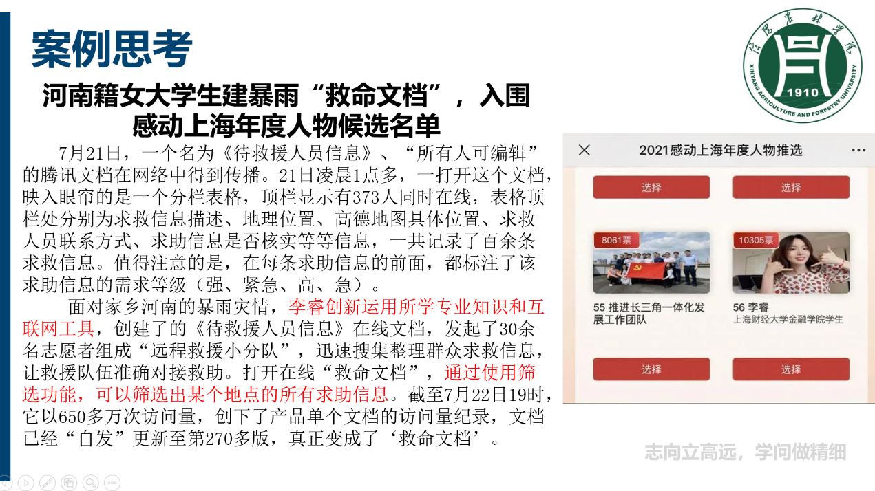 6.郭靖韬老师在《文献检索及论文写作》中以“夏礼吾能言之,杞不足征也;殷礼吾能言之,宋不足征也。文献不足故也。足,则吾能征之矣”作为案例引入。孔子虽然熟知各朝的礼法,但由于不能通过杞、宋两国现存的典籍以及贤人验证,便对古礼秉持保留的态度,不敢妄言。孔子的这种治学态度,也为后世之人树立了实事求是的典范。实事求是既是治学的态度,也是治国的精神。引导学生凡事都应以事实为根据,无论做什么也应有根有据。人类有限的生命和智慧不可能记住无边无际的知识,必须掌握在浩瀚知识海洋中获取信息的能力,这就是文献检索。并以720郑州洪水中“救命档案”引出文献检索的重要性。