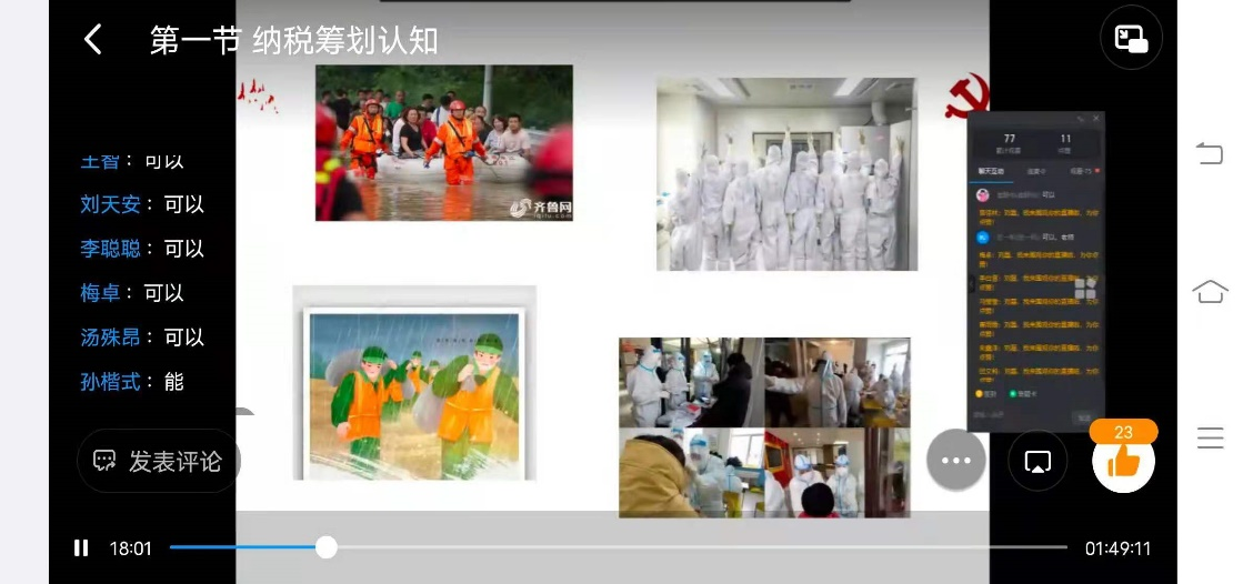 1.刘磊老师为学生讲好《纳税筹划》开学第一课,运用抗洪救灾、疫情防控中的感人素材,让学生树立起战胜灾难的决心和信心,引导学生在实践中立大志、明大德、成大才、担大任;告诫学生身为财经人,我们不仅要懂财务,更要懂得影响企业可持续发展的各项业务,不把利润作为唯一目标,要关注对人、对环境、对社会的贡献,引导学生树立和谐共生发展理念。