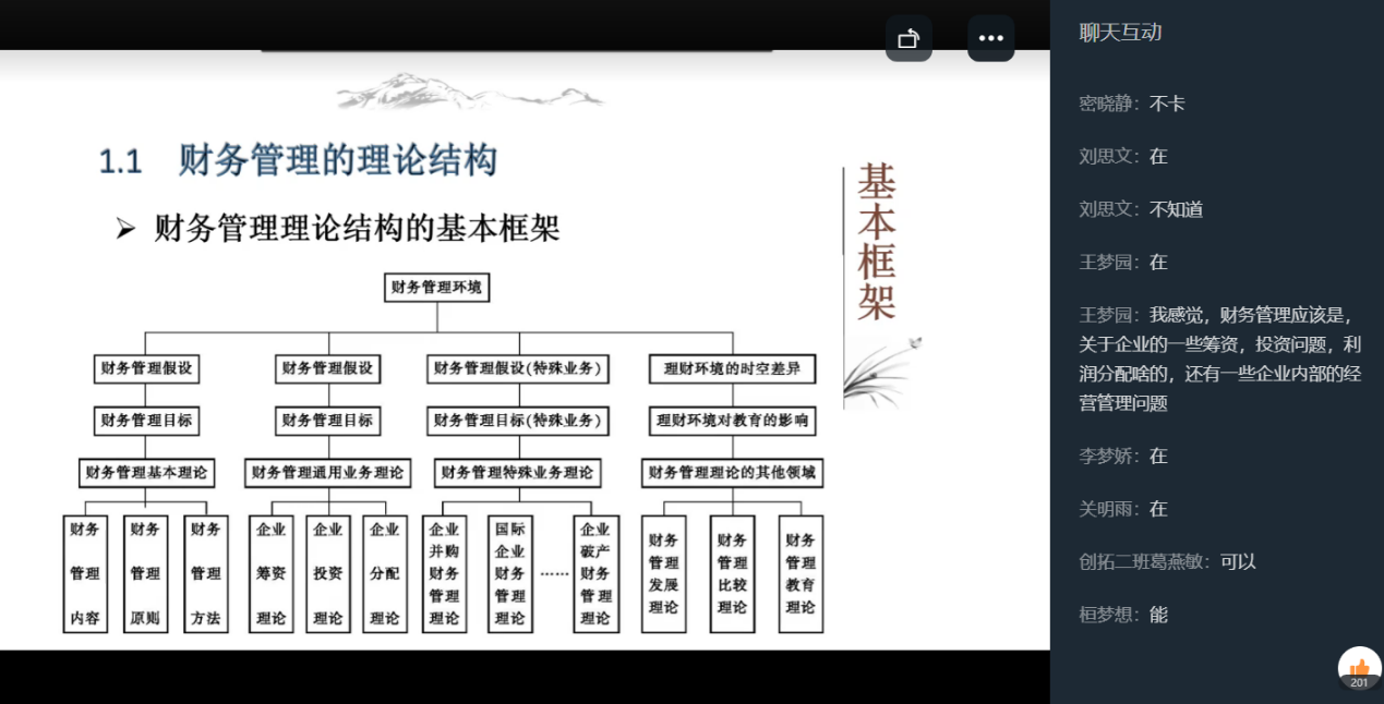 4.陈芮老师在《高级财务管理》开学第一课中结合此次河南洪水灾害以及疫情等实事,开启开学第一课,与课程内容中的风险管控、企业理财活动等内容相联系,挖掘思政元素,引导学生思考为抗击疫情,需增强企业或个人生存能力,企业在研发投资或个人理财方面,从财务核算、财务管理入手,攻坚克难,取得经济上主动。
