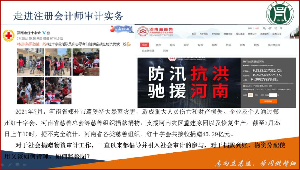 2.陈雪林老师在《审计实务》开学第一课中以河南洪灾案例引出社会捐赠物资审计工作的监督情况,鼓励学生应该运用专业知识对抗击灾害做出贡献。指出在当前大多数组织的审计实务中,现场审计仍然占绝对的主导地位。新冠疫情暴发后,现场审计工作受到极大阻碍,严重影响了原定审计计划的执行。“拥抱远程审计、引动审计数字化转型升级”是抗疫之战中组织面临的“危中之机”。