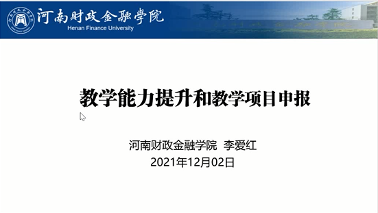 为进一步提升本科教学质量,提高教师教学技能,财经学院财务管理教研室于2021年12月2日邀请河南财政金融学院李爱红教授在腾讯会议网络平台作了题为“教学能力提升和教学项目申报”的专题讲座。讲座由财经学院院长郭春林教授主持,财务管理教研室全体教师参加。