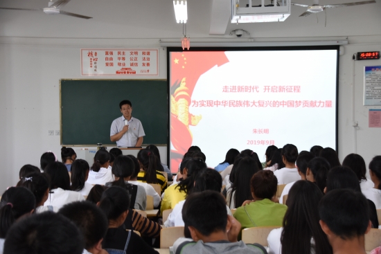 9月23日,在二号教学楼201教室,财经学院党总支书记朱长明为2019级新生做了以“走进新时代 开启新征程”为主题的入学教育报告会。
