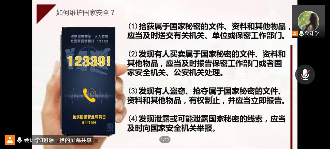4月13日学院全体班级利用课前十分钟活动开展国家安全知识学习,各班负责人给同学们讲解了国家安全的含义、国家安全的内容,以及作为当代大学生我们应怎么维护国家安全、如何培养安全意识等内容。