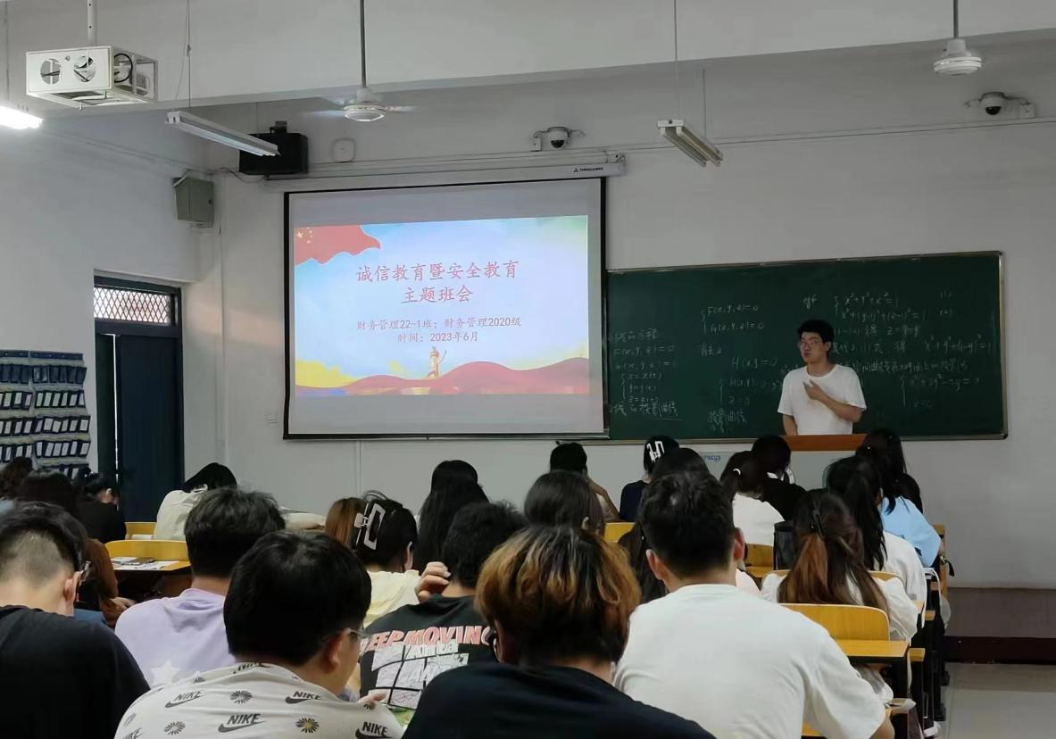 为扎实做好学生安全教育工作,进一步加强学风考风建设,强化学生树立诚信考试意识,营造公平、公正的考试氛围,财经学院于2023年6月12日至13日召开了“诚信考试暨安全教育”主题班会,各班辅导员主持会议,财经学院全体学生参与。
