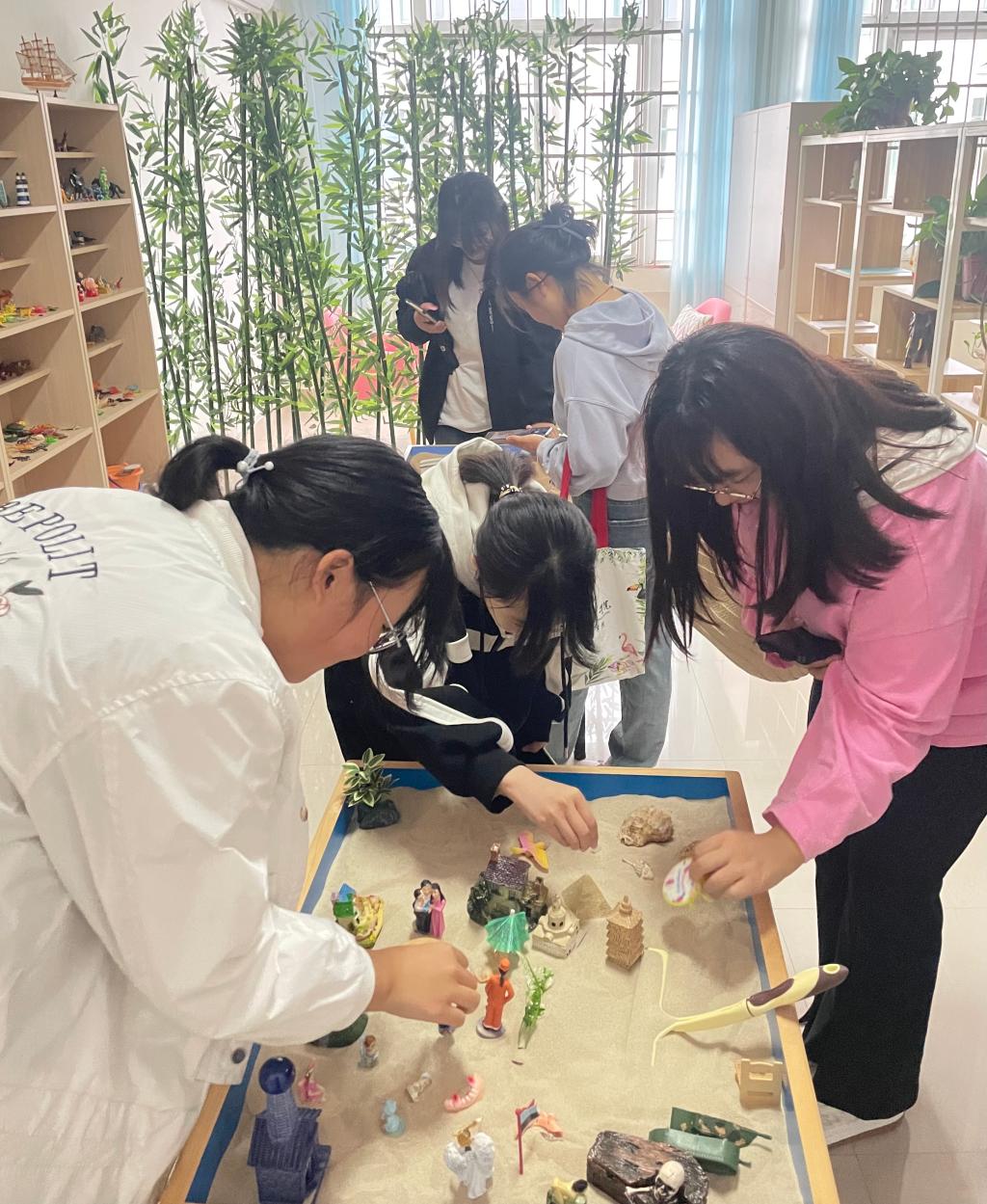 在大学生心理健康中心杜鹃老师的指引下,同学们参观了个体咨询室、心理宣泄室、沙盘室、团体心理辅导室、阳光房。在参观过程中,同学们不仅认识了不同类型的沙盘模具、放松、宣泄仪器,还亲身体验了各类有趣的解压仪器设备。