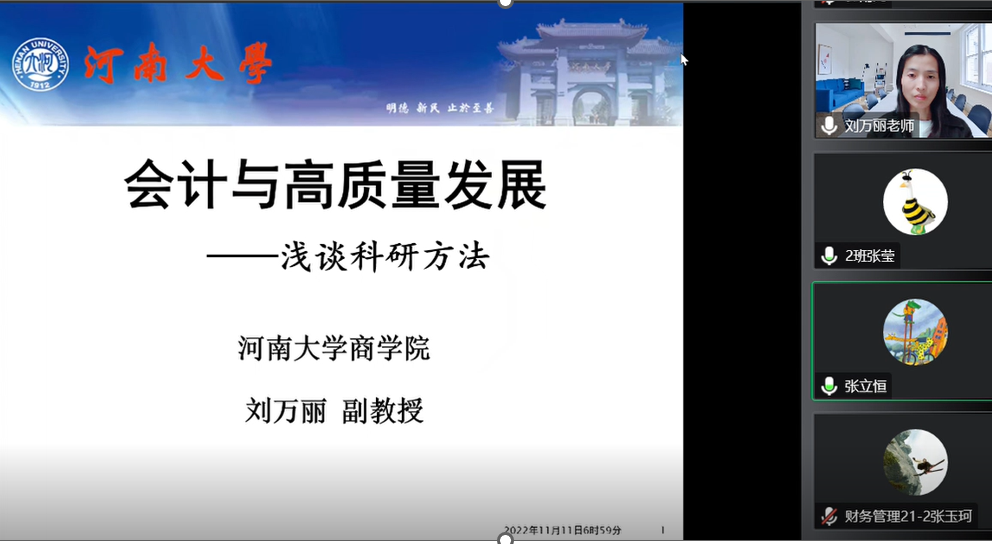 为持续推进“科研氛围营造年”系列活动,2022年11月11日晚,财经学院邀请河南大学商学院刘万丽博士开展题为“会计与高质量发展——浅谈科研方法”的学术报告。会议由财经学院副院长张立恒主持,学院全体教师及学生线上听取本次报告。
