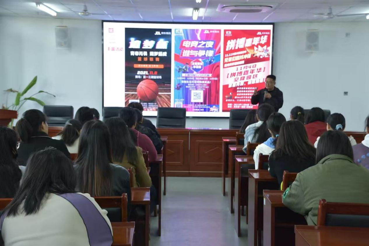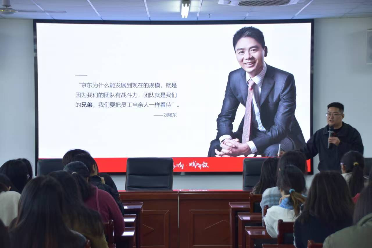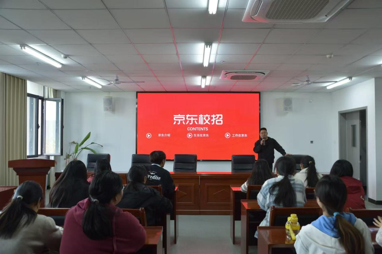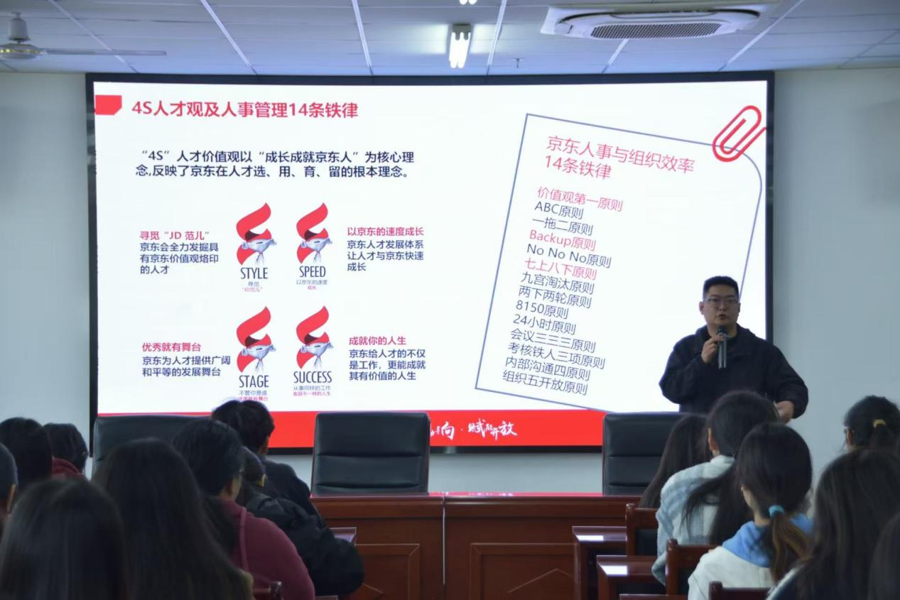 活动伊始,李高飞经理从介绍京东、生活在京东、工作在京东、互动交流四个方面向同学们介绍了公司的基本情况,着重介绍了公司的“新锐之星”培养目标、培养计划及福利待遇等方面的内容。最后的互动交流环节,学生们就自己关心的问题向李高飞经理寻求解答,李经理结合自身经历点燃学生就业热情,也为同学们提供了明确的职业导向,现场气氛热烈而融洽。