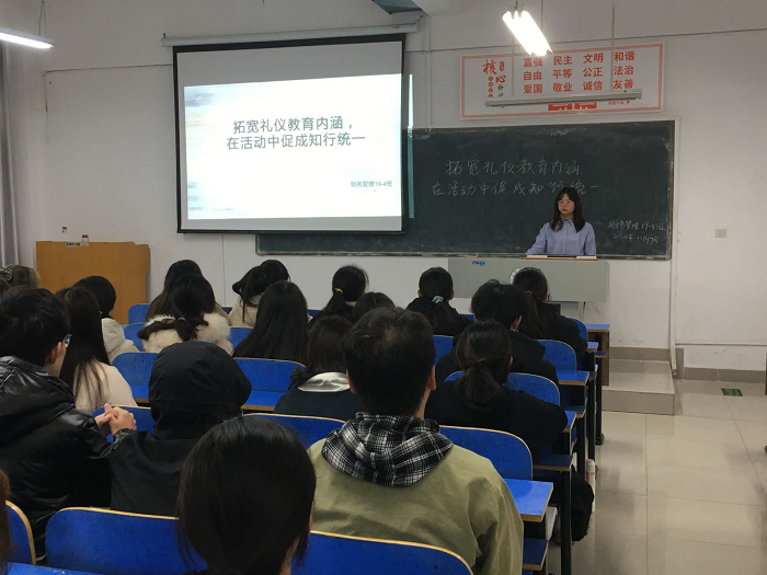 为落实文明素养提升工程,进一步强化青年学生文明意识的养成,11月20日中午,财经学院文明示范班——财务管理19-4班开展了以“拓宽礼仪教育内涵,在活动中促进知行统一”为主题的班风建设活动。本次活动重新诠释了新时期条件下班级风气建设的时代内涵和行动要求,为班风建设确立了正确方向和明确目标。