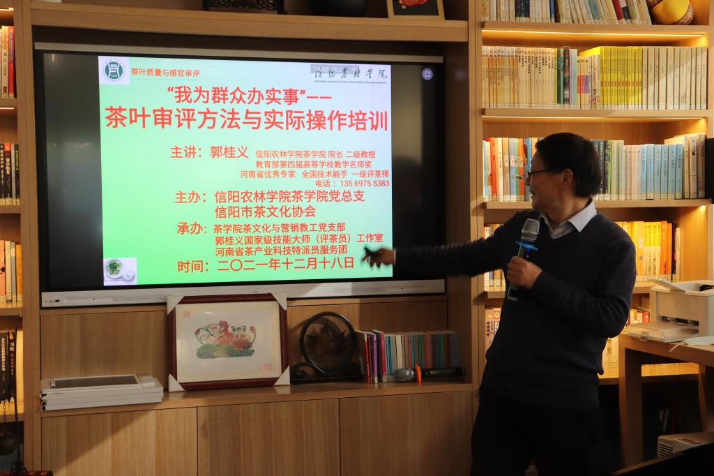 12月18日下午,在冬日暖阳的照耀下,为了让信阳市更多的茶业从业人员了解并逐渐熟悉专业的茶叶感官审评方法,利用专业的茶叶感官审评方法指导制茶技术、推销茶叶,“我为群众办实事”—beat365在线平台官网茶学院党总支联合信阳市茶文化协会共同主办,茶学院党总支茶文化与营销教工党支部、河南省茶产业科技特派员服务团、郭桂义国家级技能大师工作室承办的“茶叶审评方法与实际操作培训” 交流活动,在羊山新区“两个更好”城市书屋成功举行,来自白龙潭、集云山、四望山、金刚台等信阳毛尖主要产区的26家茶企代表汇聚一堂参加了活动,共同学习交流。活动由beat365在线平台官网茶学院茶文化与营销教研室副主任、党支部宣传委员王杉老师主持。