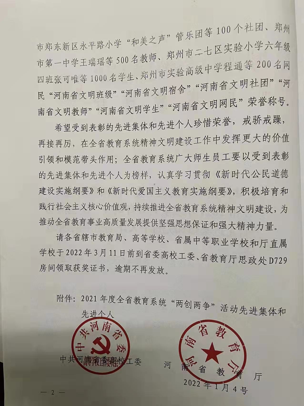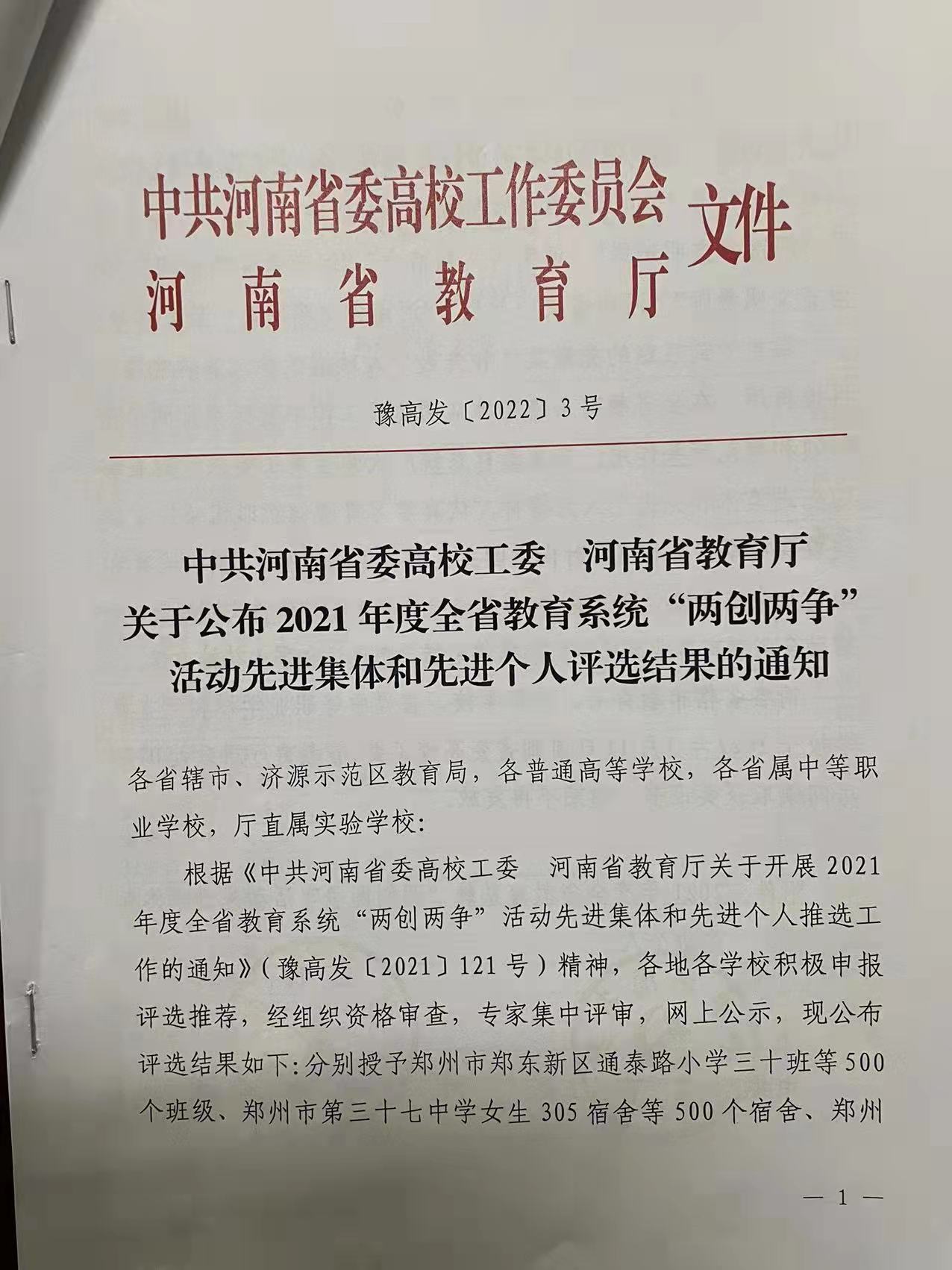 日前,中共河南省委高校工委、河南省教育厅印发了《中共河南省委高校工委 河南省教育厅关于公布 2021 年度全省教育系统“两创两争”活动先进集体和先进个人评选结果的通知》(豫高发〔20223 号),公布了2021年度全省教育系统“两创两争”活动先进集体和先进个人评选结果。茶学院党总支副书记、茶文化与营销教研室教师朱建梅被授予“河南省文明教师”,茶学(茶文化与营销方向)2019级的蒋艳群同学被授予“河南省文明学生”荣誉称号。