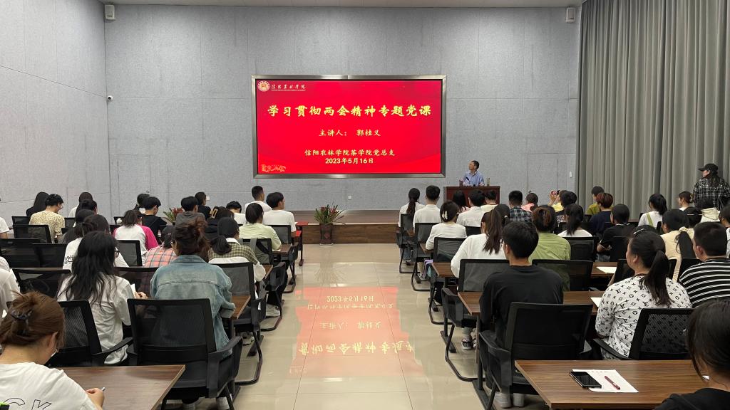 为深入开展学习贯彻习近平新时代中国特色社会主义思想主题教育,5月16日下午,茶学院党总支书记、院长郭桂义教授在学术交流中心一楼报告厅以《学习贯彻两会精神》为题讲授专题党课。茶学院党总支副书记朱建梅、团总支书记王子浩、专职组织员丁岚及茶学院学生党员、入党积极分子100余人参加。