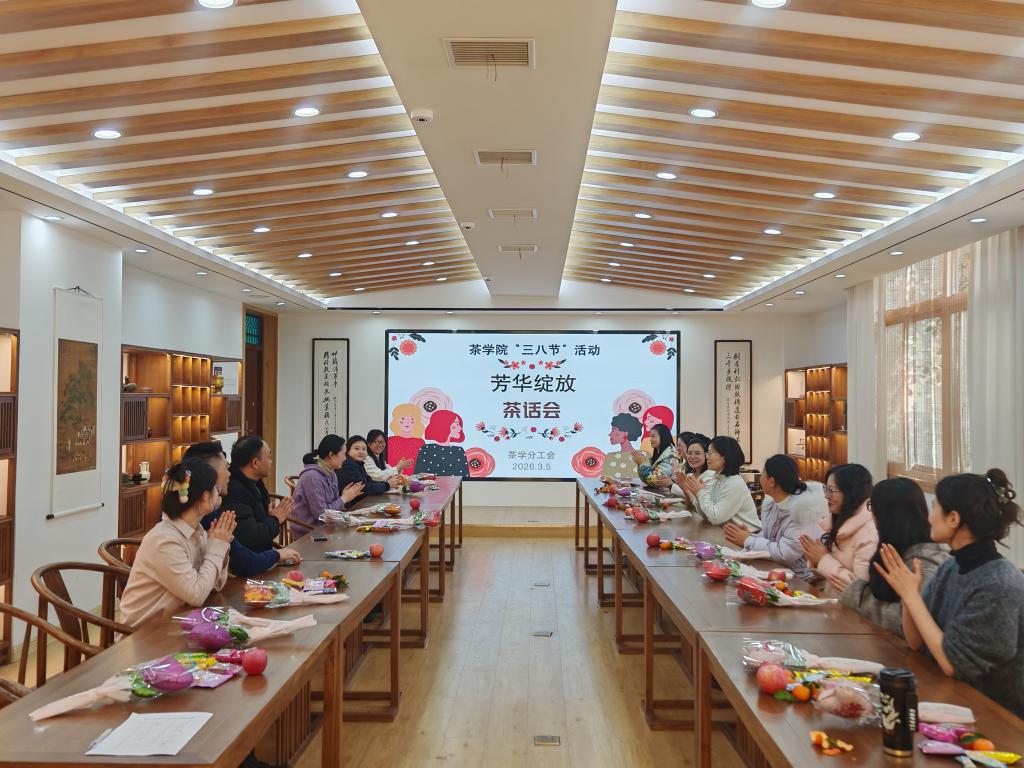 健身环节结束后,“芳华绽放”主题茶话会温情开启。女教职工们围坐畅谈,分享教学科研、育人管理中的心得感悟,交流职业成长与生活点滴,在轻松交流中增进情谊、凝聚共识,充分展现出茶学院女教师知性优雅、昂扬向上的精神风貌。