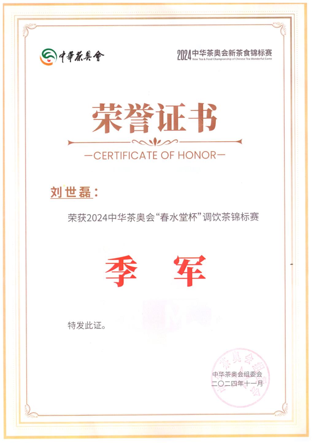 近日,由中国国际茶文化研究会指导、中华茶奥会主办的2024中华茶奥会新茶食锦标赛在龙坞茶镇圆满落幕。我院教师朱尧指导的两个作品进入了“春水堂杯”调饮茶锦标赛半决赛。我院学生刘世磊作品“潭影峦光”获半决赛第一名晋级决赛,并在决赛中获得季军。