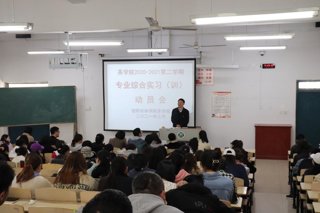 3月23日中午,茶学院在2教304召开2018级茶学(创新拓展)、2018级茶学(茶文化与营销)、2018级茶学(对口)、2020级茶学(专升本)及2019级茶艺与茶叶营销专业综合实习(训)动员会,动员会由茶学副院长孙慕芳主持。茶学院院长、党总支书记郭桂义教授、副院长陈义、党总支副书记朱建梅、茶学实验教学中心主任尹鹏、教学秘书张永瑞、辅导员池水靖、杨转、梁玉洁等教师参加了此次动员会。本次专业综合实习(训)涉及216名学生,67家茶企,其中包括了11处校外实习基地。
