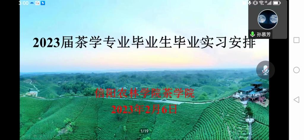 为提高毕业实习质量,2月6日下午,茶学院召开2023届茶学专业毕业生毕业实习安排会,会议以线上腾讯会议的形式开展,再次对毕业实习在人才培养中的重要性和各个环节的注意事项进行强调。会议由副院长孙慕芳主持,党总支副书记朱建梅、副院长陈义以及全体教师和2023届茶学专业毕业生参加。