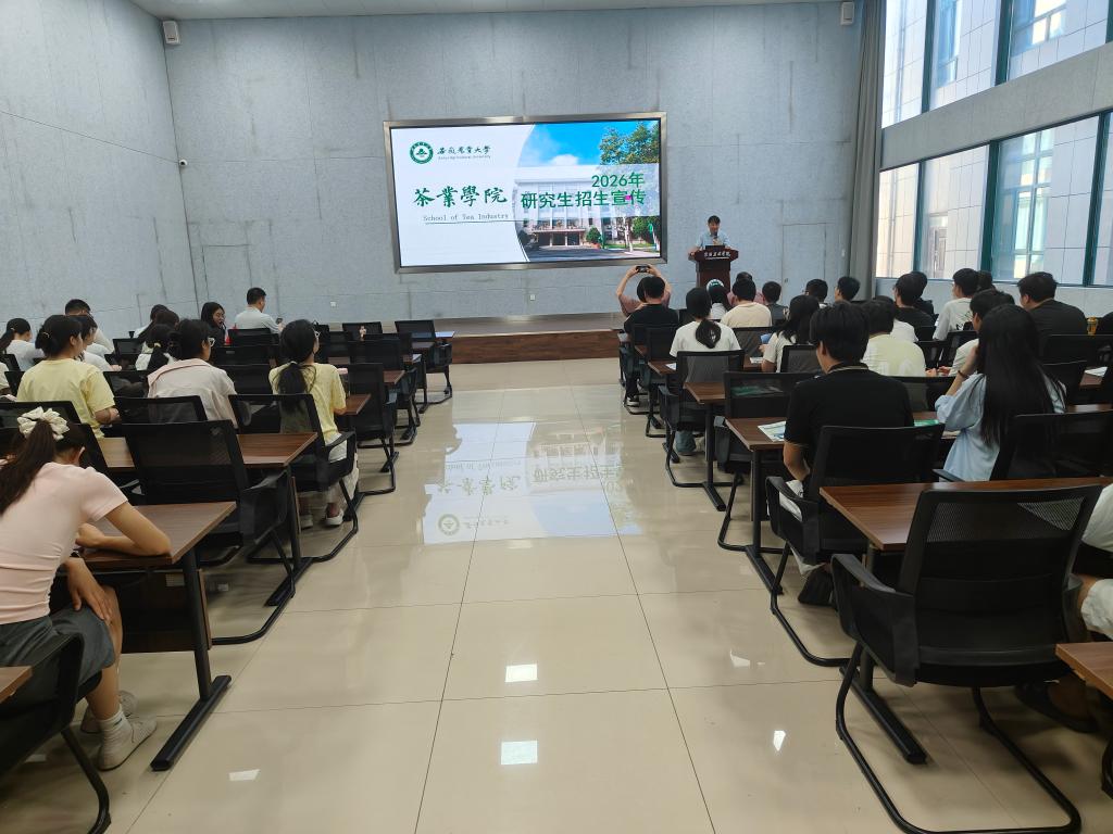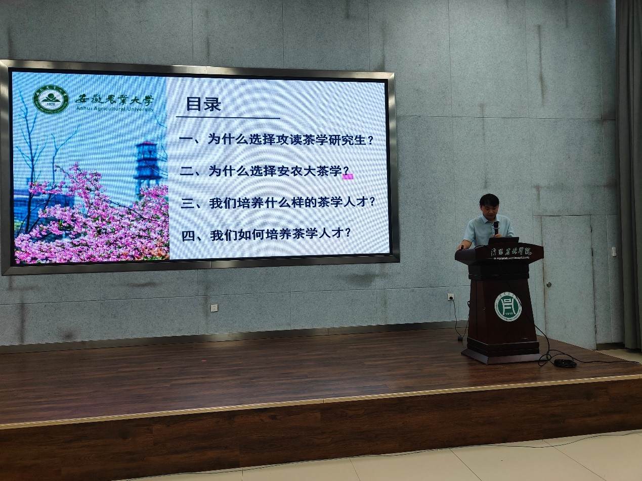 73日,安徽农业大学茶业学院副院长宋传奎教授和副院长张照亮教授一行于学术交流中心会议室,面向我院大三学子进行研究生招生宣讲,为有志深耕茶学的青年铺就清晰学术路径,报告会由茶学院党委书记王鹏主持。