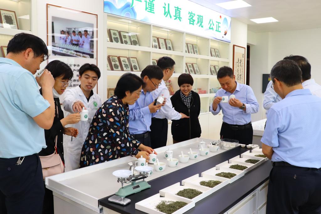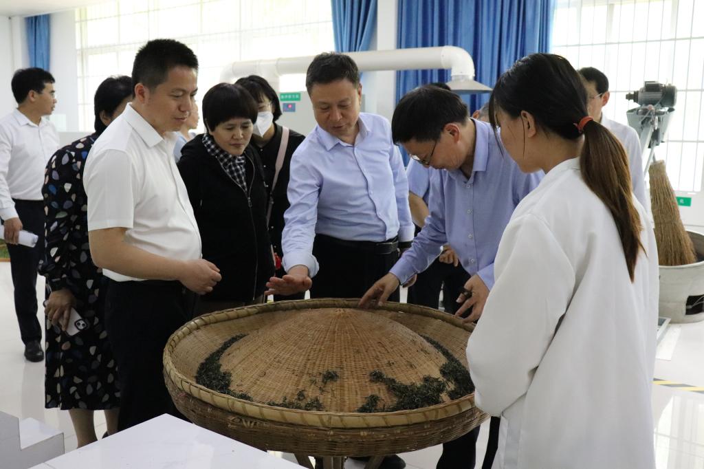 省科技厅副厅长陈志强一行实地考察了重点实验室的茶树生理生态与种质创新实验室和茶叶分析检测实验室,信阳毛尖茶加工实训室(信阳毛尖茶制作技艺信阳市非物质文化遗产社会传承基地)、六大茶类加工实训室、茶叶审评实验室(郭桂义国家级评茶员技能大师工作室)、茶艺实验室(茶艺信阳市非物质文化遗产社会传承基地)等教学科研场所。考察时,重点实验室主任、茶学院院长郭桂义教授向陈志强一行汇报了重点实验室在人才培养、科学研究、社会服务等方面所取得的成效和今后的工作。