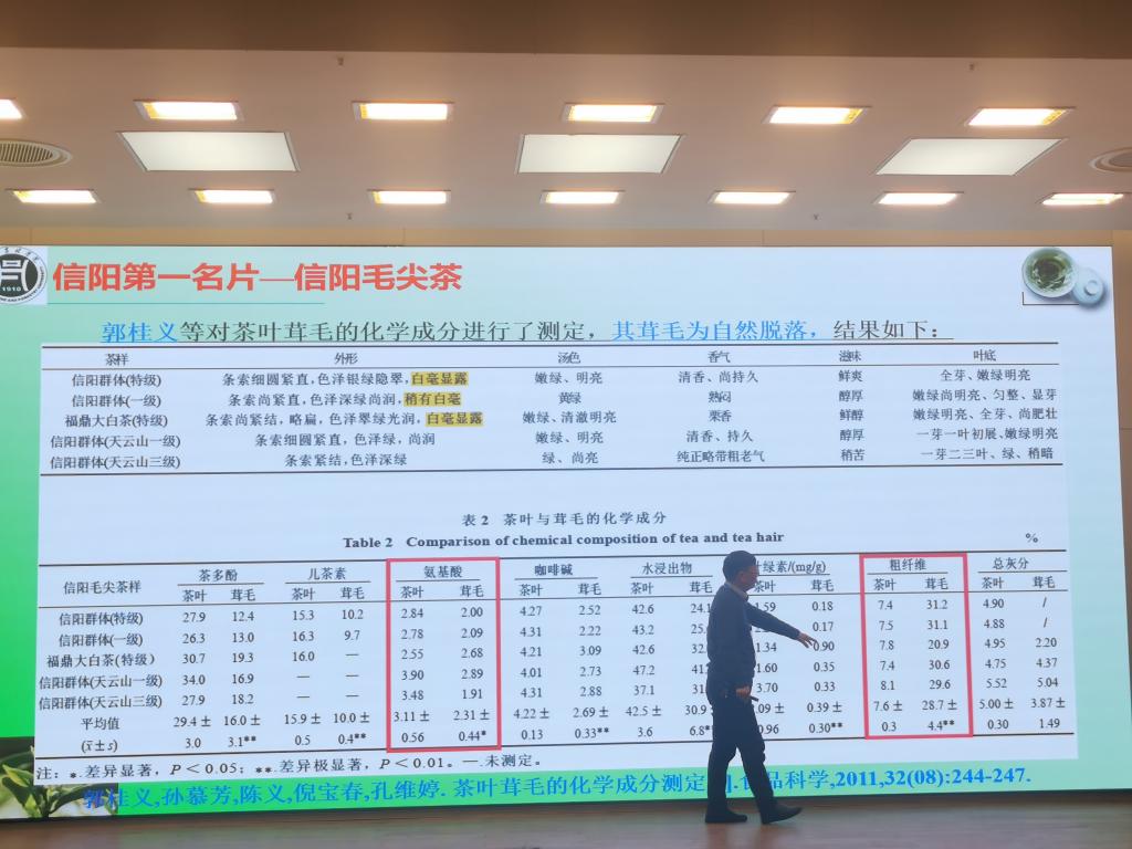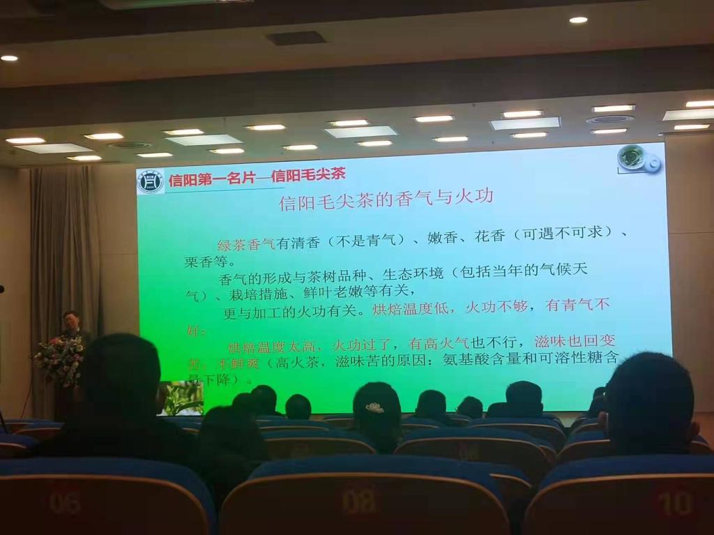 郭桂义教授从生产历史悠久、生态环境优越、茶树品种优良、品质风格独具、鲜叶要求细嫩、炒制工艺独特、化学成分丰富、冲泡品饮讲究等信阳毛尖茶的八大特点带领大家认识信阳第一名片——信阳毛尖茶。通过历史及文献的追溯,让大家了解信阳毛尖不仅生产历史悠久且品质优良,并讲述了信阳毛尖茶制作技艺于2014年被评为第四批国家非物质遗产,树立信阳毛尖茶文化自信。又从生态环境、茶树品种讲解了信阳毛尖茶品质优良的原因。随后向大家介绍了信阳毛尖的品质特征:外形细、圆、紧、直、锋苗挺秀,色泽绿润、白毫显露;内质汤色嫩绿明亮,香气嫩香、清香持久、有熟板栗香,滋味鲜浓、爽口、回甘生津,叶底嫩绿明亮、匀整。接着在原料、加工工艺、化学成分、冲泡品饮四个方面讲述信阳毛尖品质特征形成的原因。特别讲解了火工与信阳毛尖香气的关系,使大家明白板栗香的形成。讲解了茶叶茸毛(即茶毫)的化学成分含量与茶叶品质的关系,为什么红茶的毫是金毫?茶条是乌润的?绿茶是白毫,茶条是绿的?郭桂义教授还专门介绍了泡茶用水的选择,建议泡茶首先选用纯净水,矿泉水泡茶不一定好!茶区的水一般泡茶都比较好。最后郭教授说评茶是科学的、严谨的、统一的、规范的、标准的,是科学客观地评价茶叶的品质特征和品质优劣;而品茶或茶艺师,则应根据茶叶的品质特征和消费者的习惯爱好,扬长避短,灵活应变,进行冲泡,充分发挥茶叶的品质。既要有科学评茶,也要灵活品茶才能让信阳毛尖茶走的更远。
