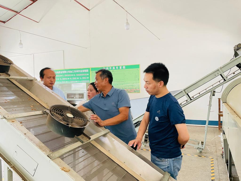 陈义教授一行在新县林业和茶产业局高级农艺师董慧与新县大地茶业有限公司负责人李东的带领下参观了信阳毛尖茶的加工生产线,陈义教授针对大地公司现有杀青、回潮工艺上存在的不足,建议高温短时杀青、输送带增设排风扇等措施来实际有效解决公司生产问题。随后,陈义教授一行前往茶园察看茶园长势与茶树品种。