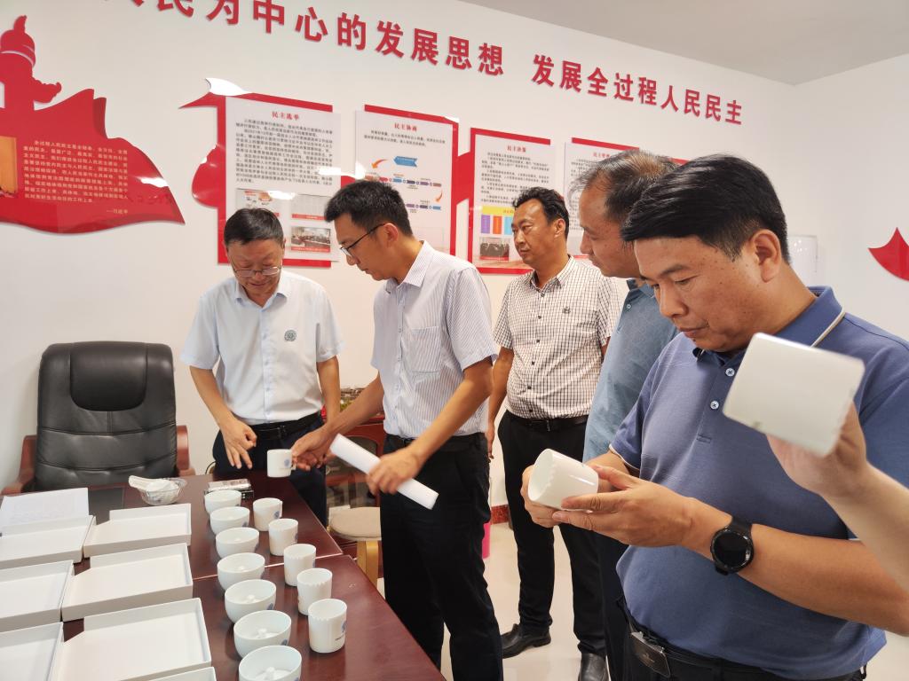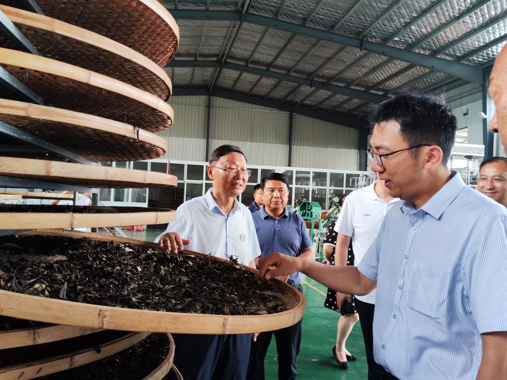 服务团一行在诚信实业开发有限责任公司总经理陈勇以及茶叶生产负责人李家猛的陪同下先实地考察了该企业的茶园,郭桂义教授就茶园管理以及该企业引种的白化、黄化茶树品种返绿等问题与企业负责人进行了交流,强调今年天气温度较高且雨水较多,杂草长势茂盛,建议企业加强夏季中耕除草,加强排水,注意预防热害和旱害;随后服务团一行又考察了公司的茶叶加工车间,对正在生产的白茶进行了技术指导,郭桂义教授指出白茶在萎凋过程中应注意环境气温以及光强,在夏季宜采用复式萎凋,避免茶叶在萎凋过程中失水过快,影响白茶的色泽、滋味和香气。期间服务团团长郭桂义教授向深入基层考察调研科技特派员工作的省科技厅副厅长潘刚汇报了河南省茶产业科技特派员服务团在科技服务方面的举措和成效,郭桂义教授表示河南省茶产业科技特派员服务团围绕标准引领、品种培优、茶叶品质提升、茶叶品牌打造,开展了从茶树良种选择及配套优质高效栽培、茶园病虫害绿色防控、低产茶园改造、茶叶加工与新产品开发、茶叶营销与茶文化推广、茶旅游开发等方面的全产业链科技服务;近期不断创新服务模式,开展茶叶感官技术培训,同时向茶企、合作社、茶农赠送茶叶感官审评专用用具(样品盘、审评杯、审评碗等),希望更多的茶叶企业、合作社、茶农用专业的《茶叶感官审评方法》审评自己的每批茶叶,准确客观评价自己的每批茶叶品质的优劣,不断改进制茶技术,保证和提高茶叶品质。潘厅长对服务团开展科技服务的方式与成效给予肯定。