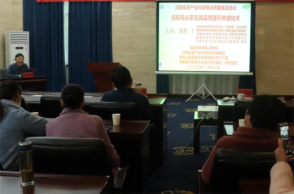 郭桂义教授围绕信阳毛尖茶发展历史与加工技艺关键程序、信阳毛尖茶市场现状与区域差异、信阳毛尖茶生产条件的进步与市场需求变化以及信阳毛尖滋味化学成分与滋味特征等方面展开讲解,其中郭桂义教授详细介绍了摊放、火功等品质提升的关键技术,在香气与火功方面,讲到原料细嫩茶叶的火功要适当,粗老茶叶与夏秋茶叶的火功可以适当稍高,强调了加工技术对信阳毛尖茶的品质的影响,加工者和消费者不能片面追求条形紧细,需要协调好外形与内质的关系,注重信阳毛尖茶的科学冲泡方法,针对性地指导帮助茶农解决茶叶种植、生产、加工、品鉴等方面遇到的困难与问题。