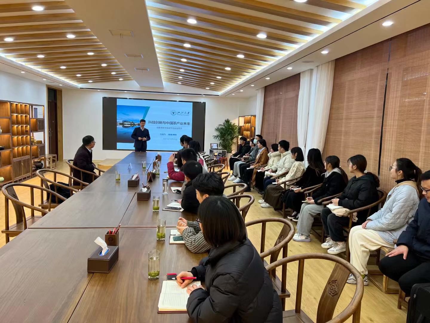 1225日,茶学院“茶苑大讲堂”第三讲开讲,茶学院邀请国务院学科评议组(园艺学科)成员、中国科协全国首席科学传播专家、浙江大学茶学学科带头人、浙江大学茶叶研究所所长、博士生导师王岳飞教授在茶艺教学实验室为茶学院师生作了题为“科技创新与中国茶产业未来”的学术报告。茶学院院长、党总支书记郭桂义、副院长孙慕芳、陈义、党总支副书记朱建梅及全体专业教师、部分学生参加报告会。报告会由郭桂义教授主持。