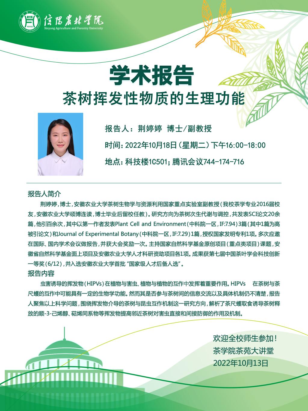 茶学院茶苑大讲堂第六讲—安徽农业大学荆婷婷博士:茶树挥发性物质的生理功能