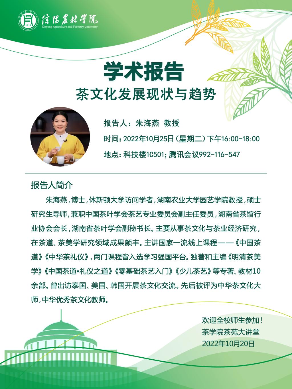 茶学院茶苑大讲堂第七讲预告—湖南农业大学朱海燕教授:茶文化发展现状与趋势