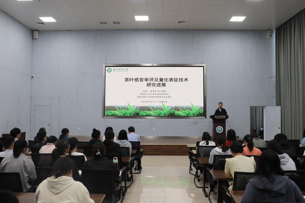 报告会上,陈院长首先介绍了戴前颖教授的研究方向和研究成果。随后,戴前颖教授围绕茶叶感官审评及量化表征技术的主题,结合自身研究成果,从色泽的表征及应用、香气的评价、滋味的量化及应用、感官评价方法在皖西黄茶实物标准样研制上的应用等四个方面展开了具体论述。戴教授的报告深入浅出,拓宽了师生的视野,增加了师生对茶叶感官审评及量化表征技术研究的了解。