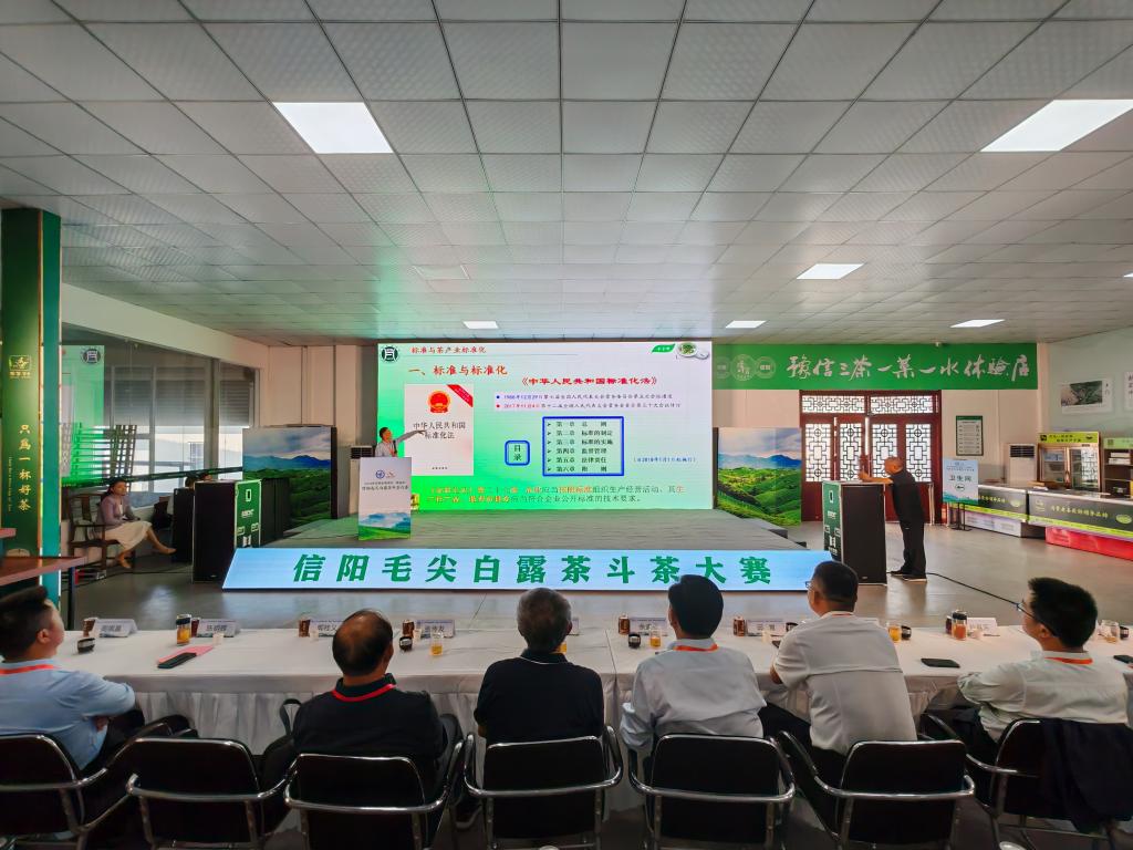 郭桂义教授以《信阳毛尖茶品质提升与茶叶标准化》为题,为在场政府相关部门、茶叶企业、茶叶从业人员及社会人员100多人讲授茶叶品质提升和茶叶相关标准化知识。