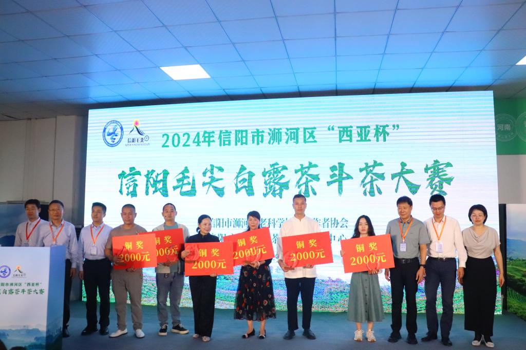 最后,郭桂义受邀为2024年度信阳市浉河区“西亚杯”信阳毛尖白露茶斗茶大赛铜奖进行颁奖。(摄影/卫艺炜 撰稿/王晶晶 卫艺炜)