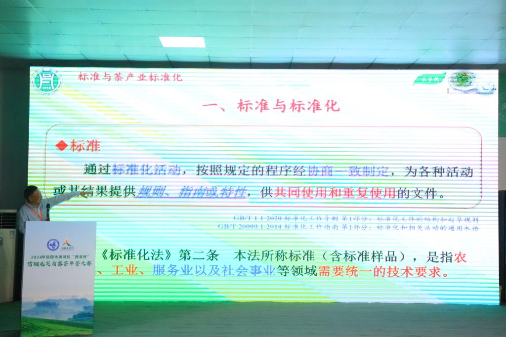 其次,介绍了标准、标准化、标准分类等基本知识,强调了国家强制性标准和国家推荐性标准的性质,并介绍了GB 31608-2023《食品安全国家标准 茶叶》、GB 7718-2011《食品安全国家标准 预包装食品标签通则》、国家标准GB/T 22737-2008《地理标志产品 信阳毛尖茶》、供销合作行业标准GH/T 1248-2019《信阳红茶》和信阳市茶叶协会团体标准T/XYCY 001-2024《信阳白茶》等与信阳茶产业密切相关的标准。建议茶叶企业及相关从业人员充分发挥技术优势企业作用,根据市场需求及自身需求制定团体标准,加强茶叶社会团体制定原创性、高质量标准。郭桂义强调茶叶标准的制定和实施对茶叶产品的提质增效,对茶产业的推动助力都有着积极意义,建议茶叶产品从生产到包装都要做到有标可依、有标可循,用高标准助力茶叶高质量。