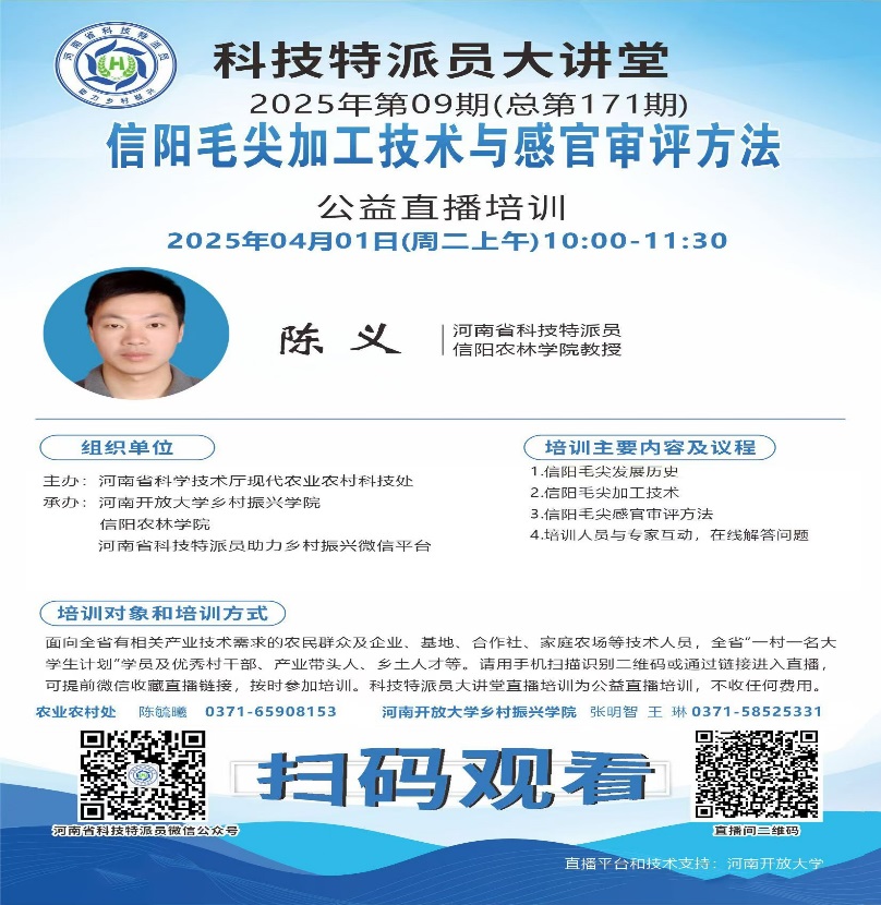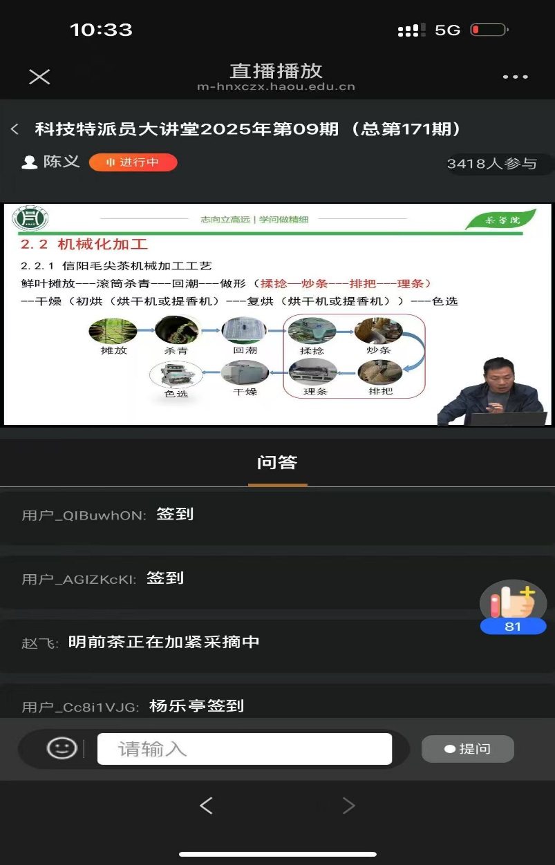 为助力茶产业提质增效,指导2025年信阳毛尖春茶生产,以科技赋能助力乡村振兴。4月1日上午,我院河南省科技特派员陈义教授受河南省科技厅现代农业农村科技处的邀请,赴郑州做河南省科技特派员大讲堂公益培训。培训采用线上直播形式进行,陈义教授的培训题目为“信阳毛尖加工技术与审评方法”,在培训中,他从信阳毛尖生产历史与荣誉、标准化发展历程、信阳毛尖加工工艺相关术语及注意事项、信阳毛尖加工工艺演变历史、信阳毛尖加工工艺流程、信阳毛尖感官审评方法等方面进行了详细讲解,并分享了不同做形对信阳毛尖耐泡性影响、不同嫩度信阳毛尖品质特点、不同鲜叶部位鲜叶生化成分特点等近年相关研究结果。陈义教授在培训前对课件和讲稿进行了精心准备,培训过程中他细致讲解,条理清晰,深入浅出,培训结束后对培训人员提出的问题进行了详细解答。本次培训在线人数高达3400余人,取得了较好成效,得到了广泛的关注 。(撰稿:罗金蕾  摄影:河南开放大学张明智)