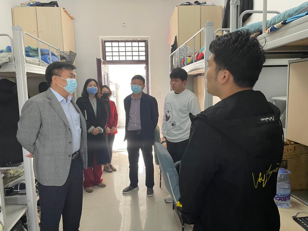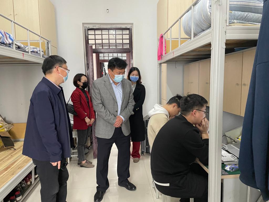 在学生宿舍,黄书记了解了学生线上上课情况,仔细察看了学生的住宿条件和生活环境,并与没有课的同学进行了亲切交谈。他询问了同学们疫情封校管理期间的生活、学习和心理状态,提醒同学们在校期间要高度重视疫情防控工作,按时打卡,严格履行外出请假手续;要注意饮食卫生和食品安全,积极参与体育锻炼,增强体魄,做好个人防护。同时,黄书记还了解了同学们在未来考研、工作等方面的计划,并给学生提出建议,勉励同学们积极进取,扎实学习专业知识,做好现阶段规划,拼搏成就美好未来。