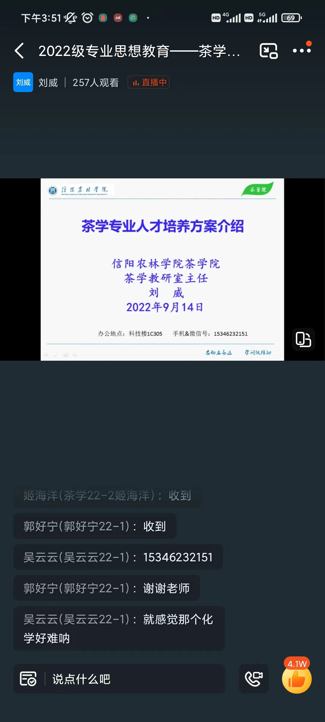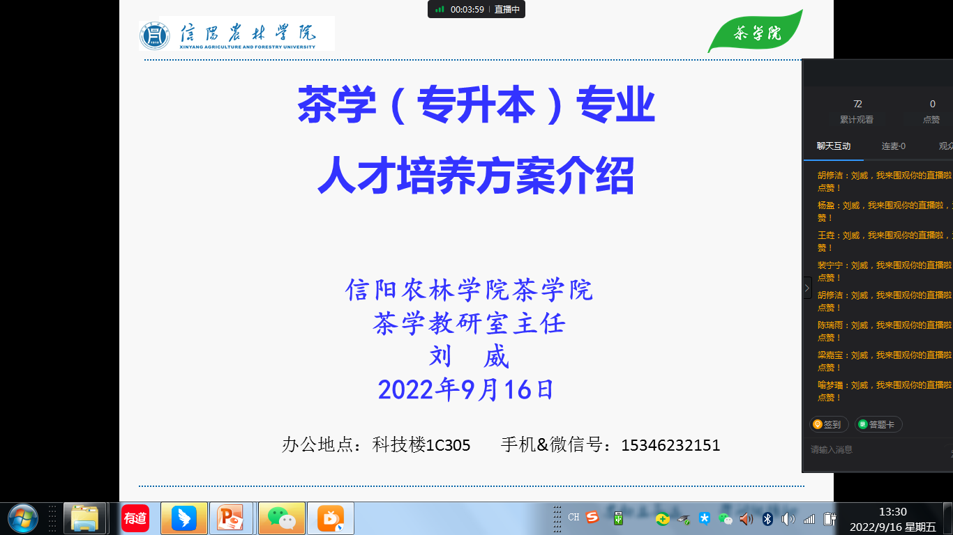 为提高2022级新生对茶学专业人才培养方案、专业学习、就业等方面的了解,茶学院分别于9月14日和9月16日利用钉钉教学平台举行2022级茶学专业、茶学(专升本)专业人才培养方案介绍会。介绍会由茶学教研室主任刘威老师主持并负责讲解,茶学院副院长孙慕芳、茶学院党总支副书记朱建梅以及2022级全体本科生参加了会议。