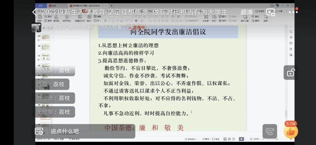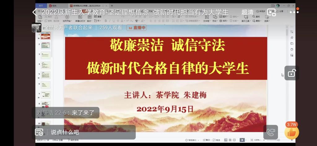 为深入学习领会习近平总书记关于关于廉洁文化建设的重要论述精神,贯彻落实清廉河南建设关于推进清廉学校行动的有关要求,进一步强化beat365在线平台官网大学生廉洁自律意识,引导大学新生系好人生第一粒扣子,帮助他们树立正确的世界观、人生观和价值观,结合我院新生入学教育工作安排,9月15日,茶学院党总支在2022级新生中开展以《敬廉崇洁诚信守法 做新时代合格自律大学生》为题的廉洁教育第一课。课程由茶学院党总支副书记朱建梅主讲,全体新生参与了学习。