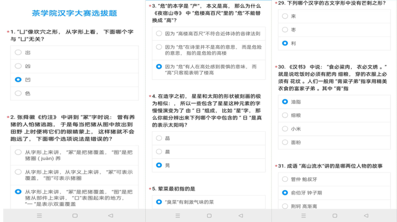 为规范汉字书写,提升学生的综合素养,保护与传承中华优秀传统文化,加深对祖国汉字文化的认识和理解,茶学院于3月1日晚18:30在1C307举行了汉字大赛初赛,共44名学生参与,比赛以线上答题的方式进行。
