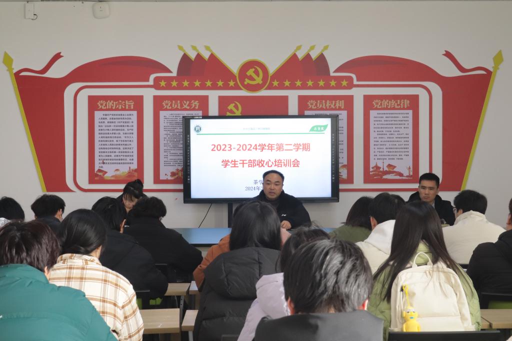 春入校园、生机勃发。新学期伊始,为了让我院学生干部凝心收心,在思想上重视起来、在身体上紧张起来、在生活上规律起来,尽快从放假状态调整为学习生活状态,3月1日,茶学院在科技楼1C307召开了2023-2024学年第二学期学生干部收心培训会。院党总支书记王鹏、党总支副书记王子浩、茶学第二学生党支部书记梁玉洁以及主要学生干部、社团负责人参加了本次培训会。会议由王子浩主持。