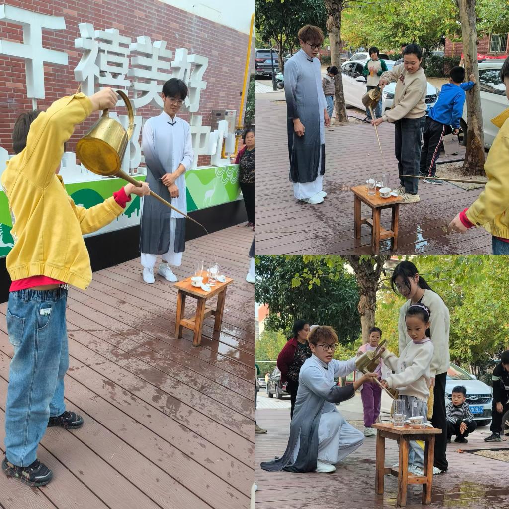 学院长嘴壶茶艺队在社区户外广场进行了一场长嘴壶茶艺表演。学生手持嘴长一米多的铜壶,翻转腾挪,提壶把盏,准确将水注入杯盏中,每一式龙行云动,招招景驰浪奔,令人目不暇接,赢得现场群众阵阵掌声。表演结束后,感兴趣的小朋友跃跃欲试,学生们指导小朋友练习基本的动作招式。