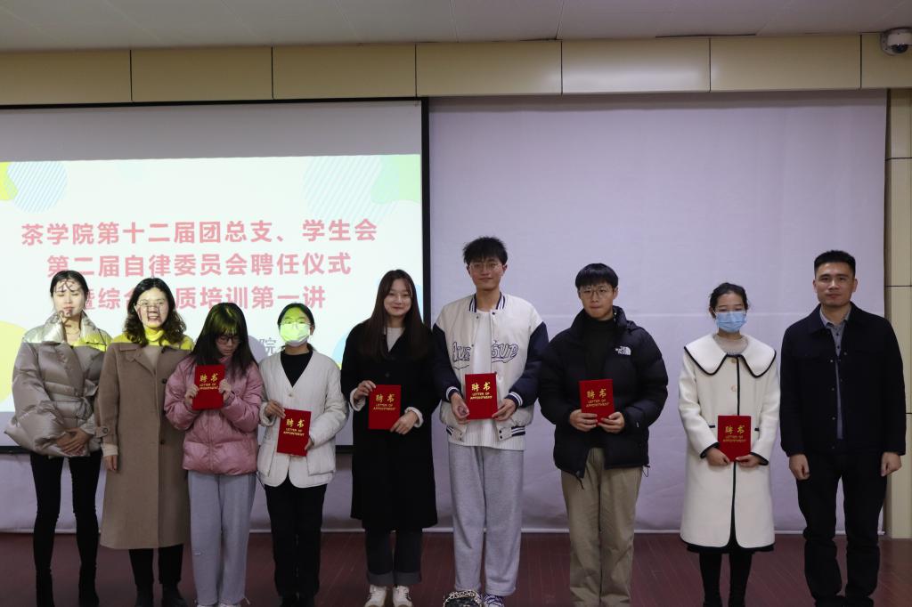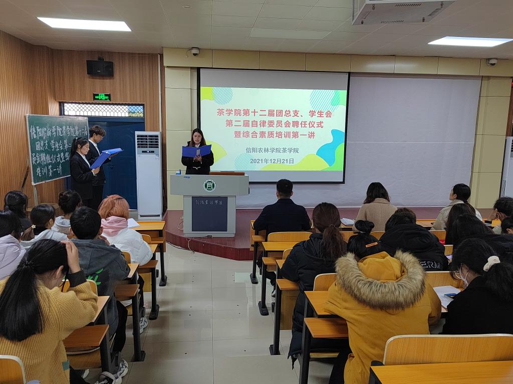 12月21日中午,茶学院在二教204举行第十二届团总支、学生会,第二届大学生自律委员会成立聘任仪式,茶学院党总支副书记朱建梅,团总支书记王子浩,专职辅导员丁岚及全体学生干部参加仪式。
