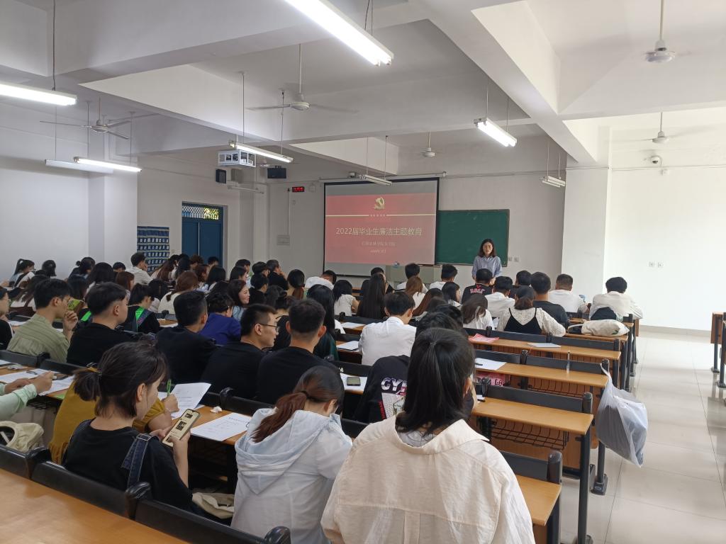 为帮助毕业生树立遵法、崇廉、守信的人生观,强化毕业生的廉洁自律意识,提高毕业生的思想政治素质,6月23日上午,茶学院2022届毕业生廉洁教育大会在一教103举行,由茶学院党总支副书记朱建梅主讲,2022届全体在校毕业生参加了大会。